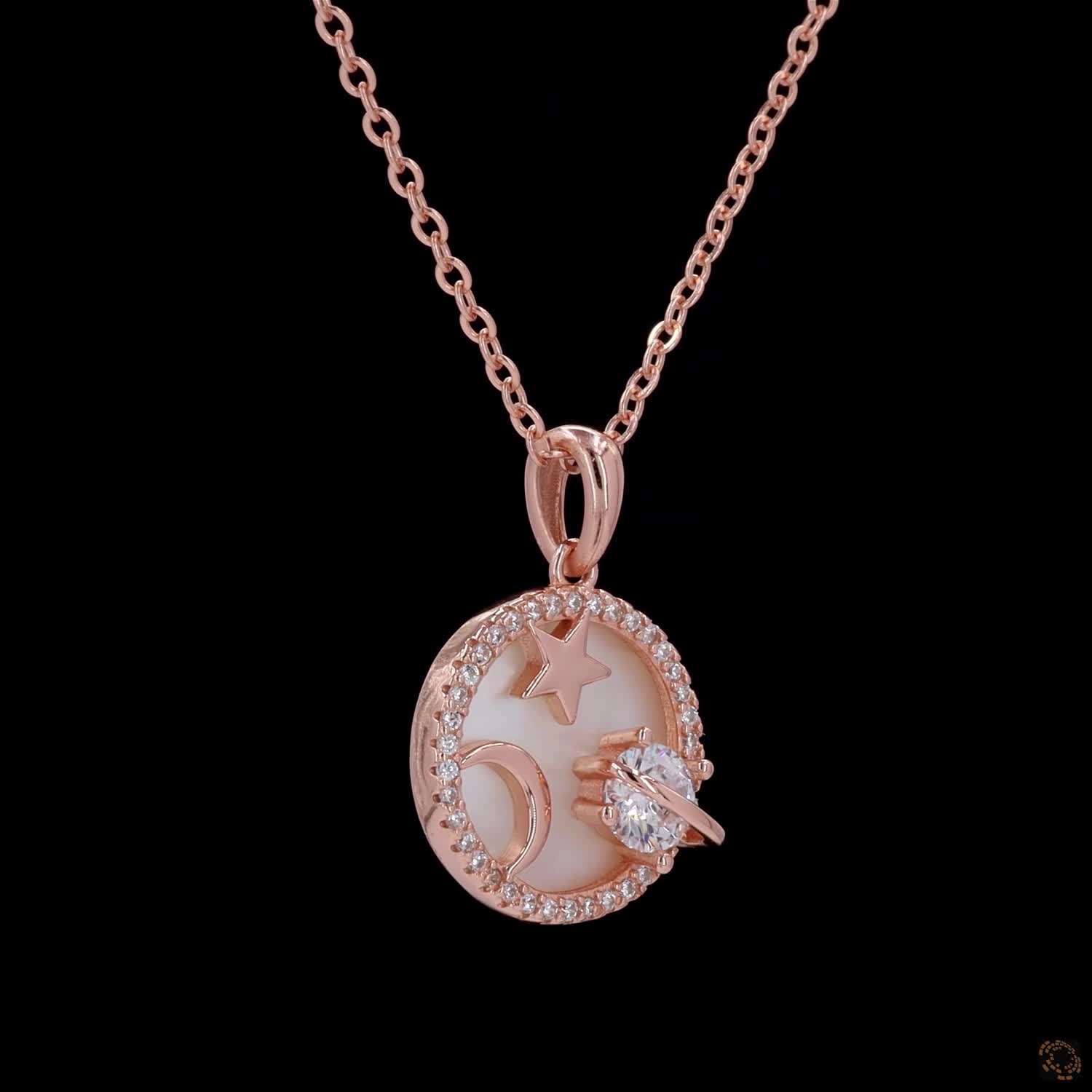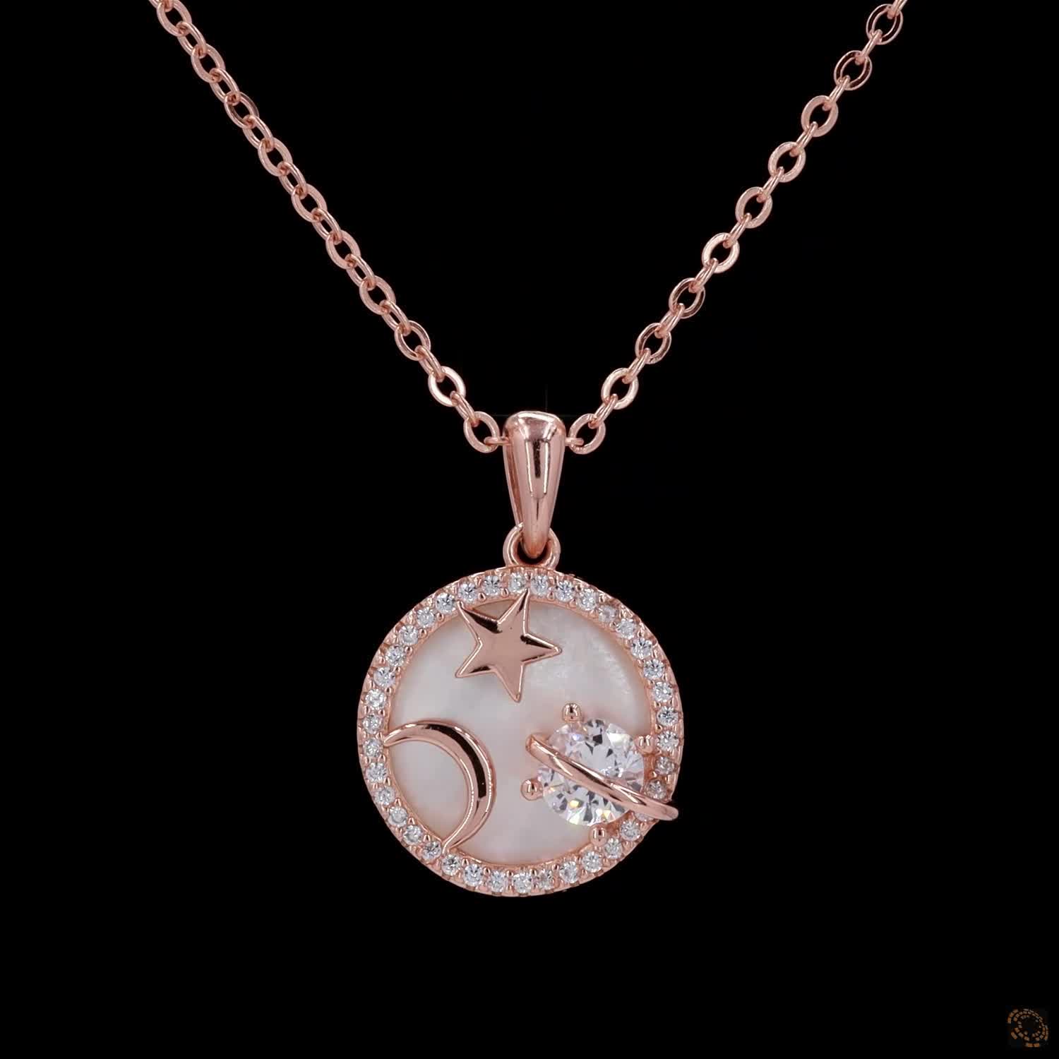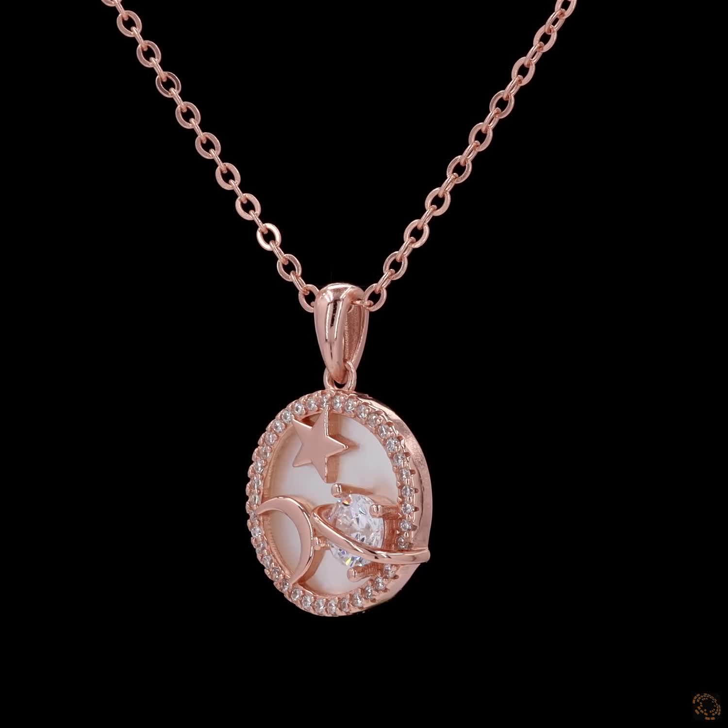 Celestial Élan is a rose-gold plated necklace featuring a round enamel base, detailed with a delicate star and moon, accented by a single diamond that catches light with subtle brilliance. Thoughtfully balanced and refined, the motif rests softly at the collarbone—elegant, modern, and endlessly wearable.