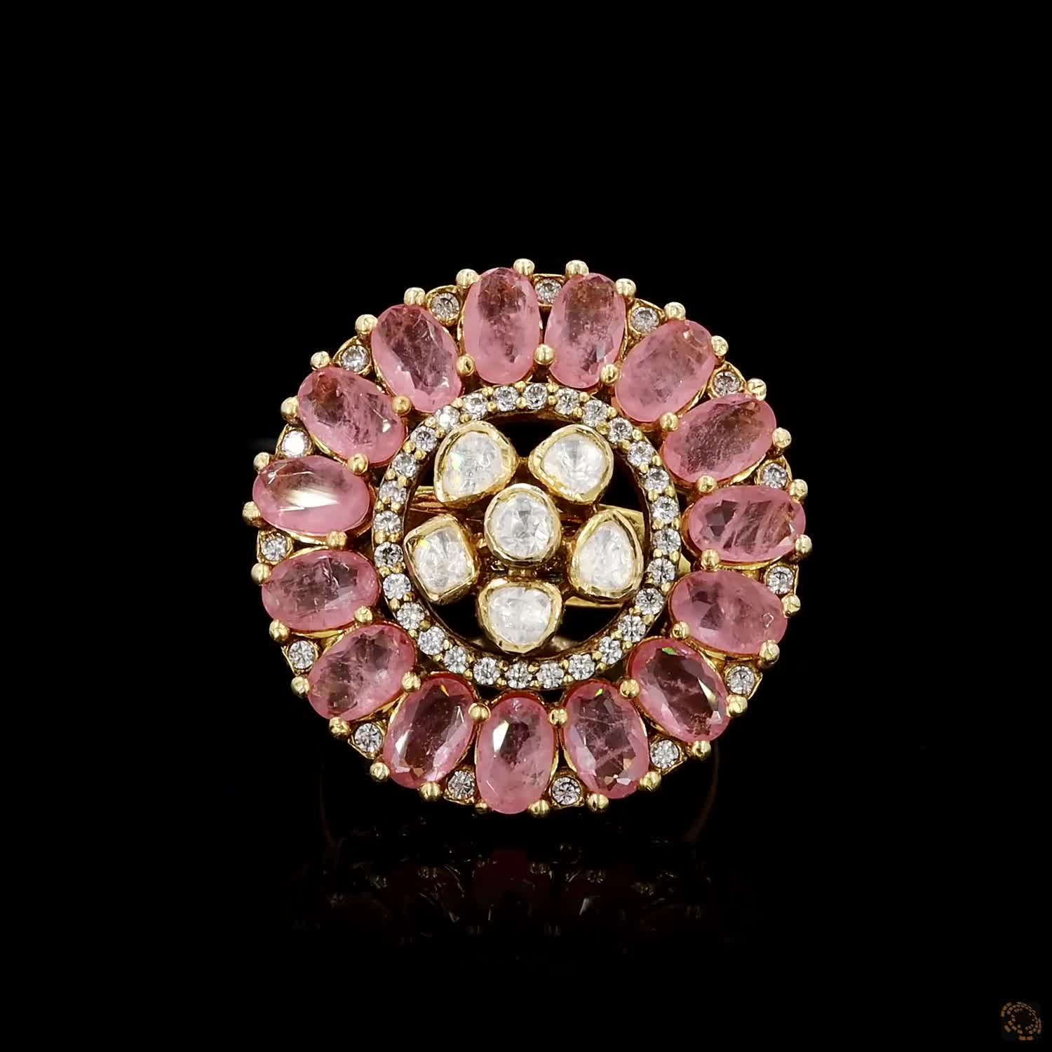 Jaipur Blush is a Polki ring designed with soft pink and classic white stones, brought together in a warm gold-polished finish. The colours are intentionally balanced — refined enough for everyday wear, distinctive enough to feel special.