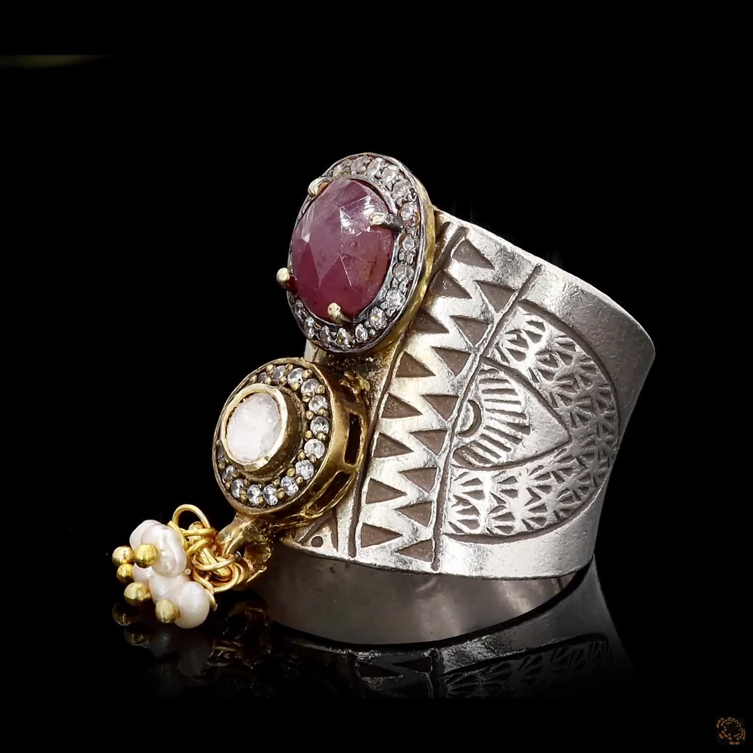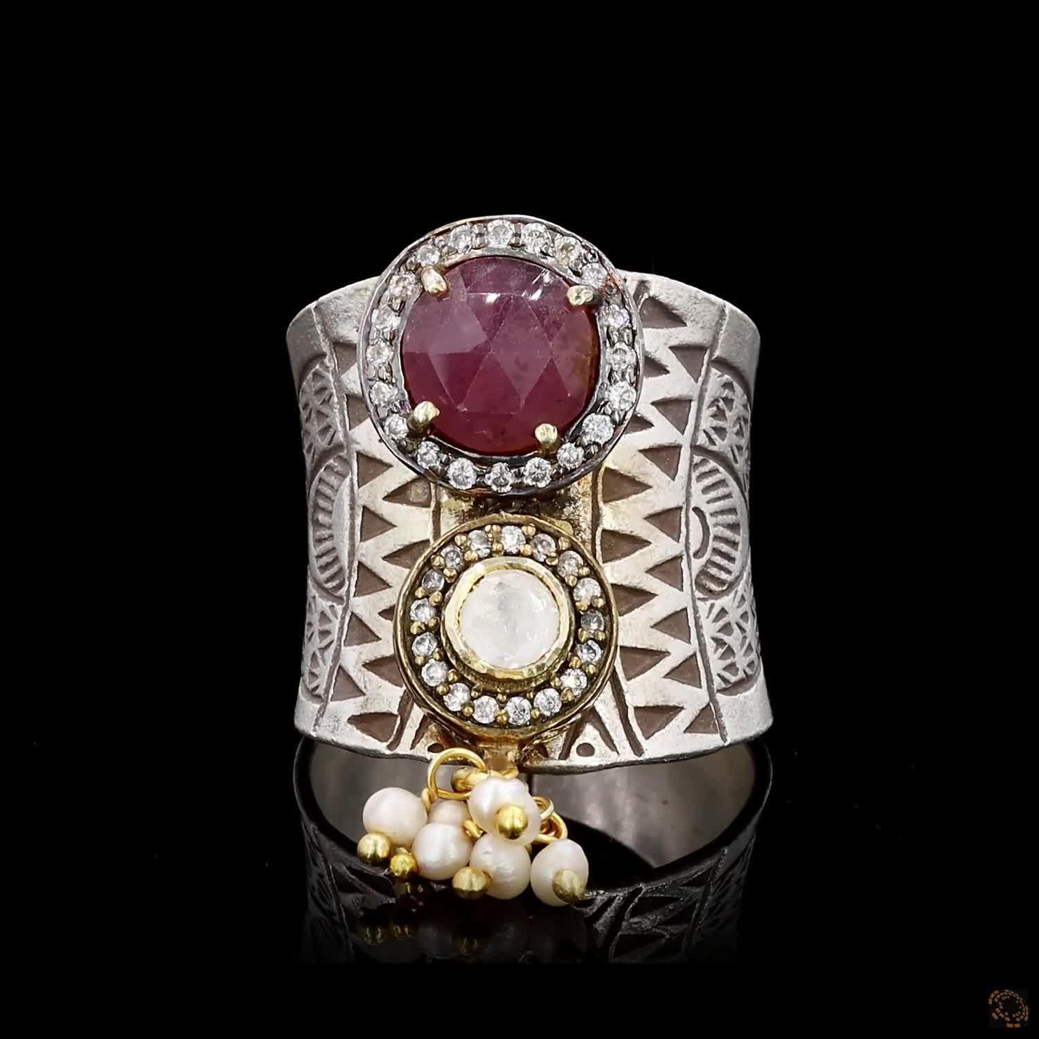 The design draws inspiration from traditional jhumri silhouettes — reimagined into a ring that feels ceremonial yet modern. The soft movement of the danglings brings rhythm and drama, while the adjustable band ensures comfort without compromising on presence.