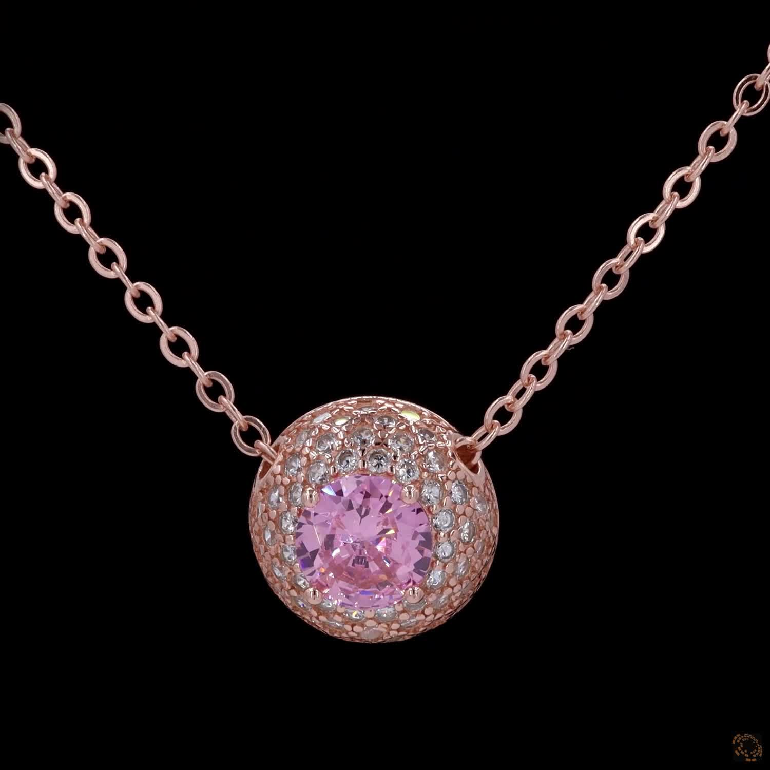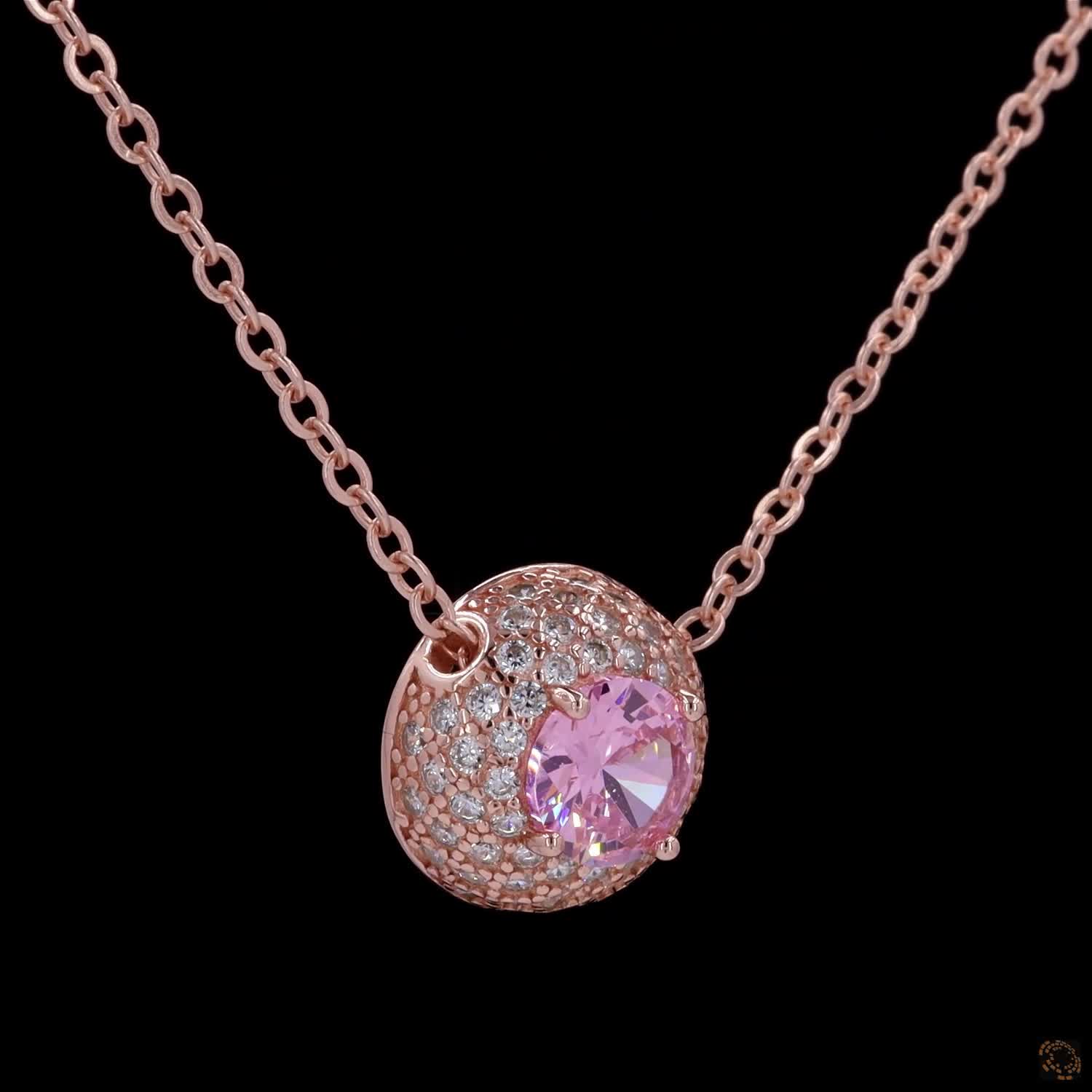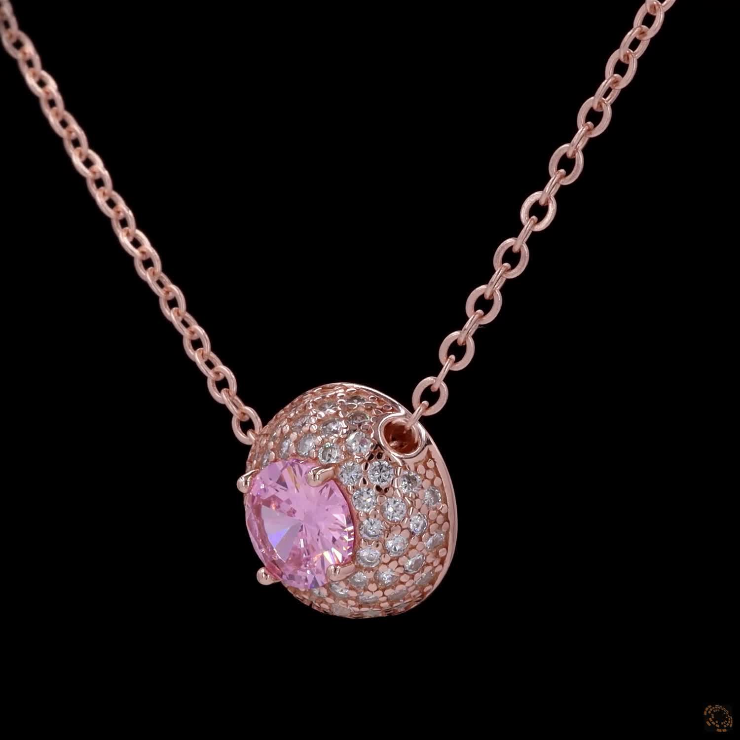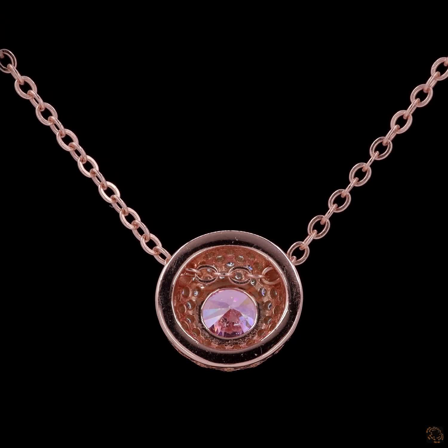 Rosé Halo features an intense pink diamond at its centre, encircled by a refined halo of diamonds that amplify its glow without overpowering it. Finished in warm rose-gold plating, the round motif rests delicately at the collarbone—subtle in scale, striking in presence.