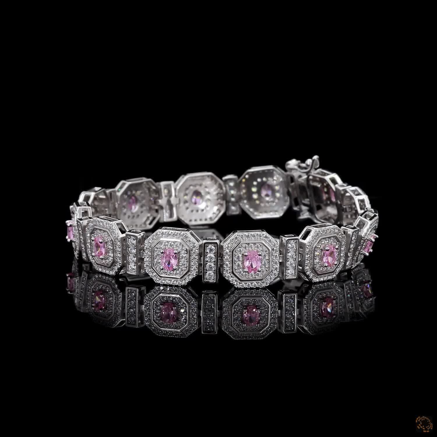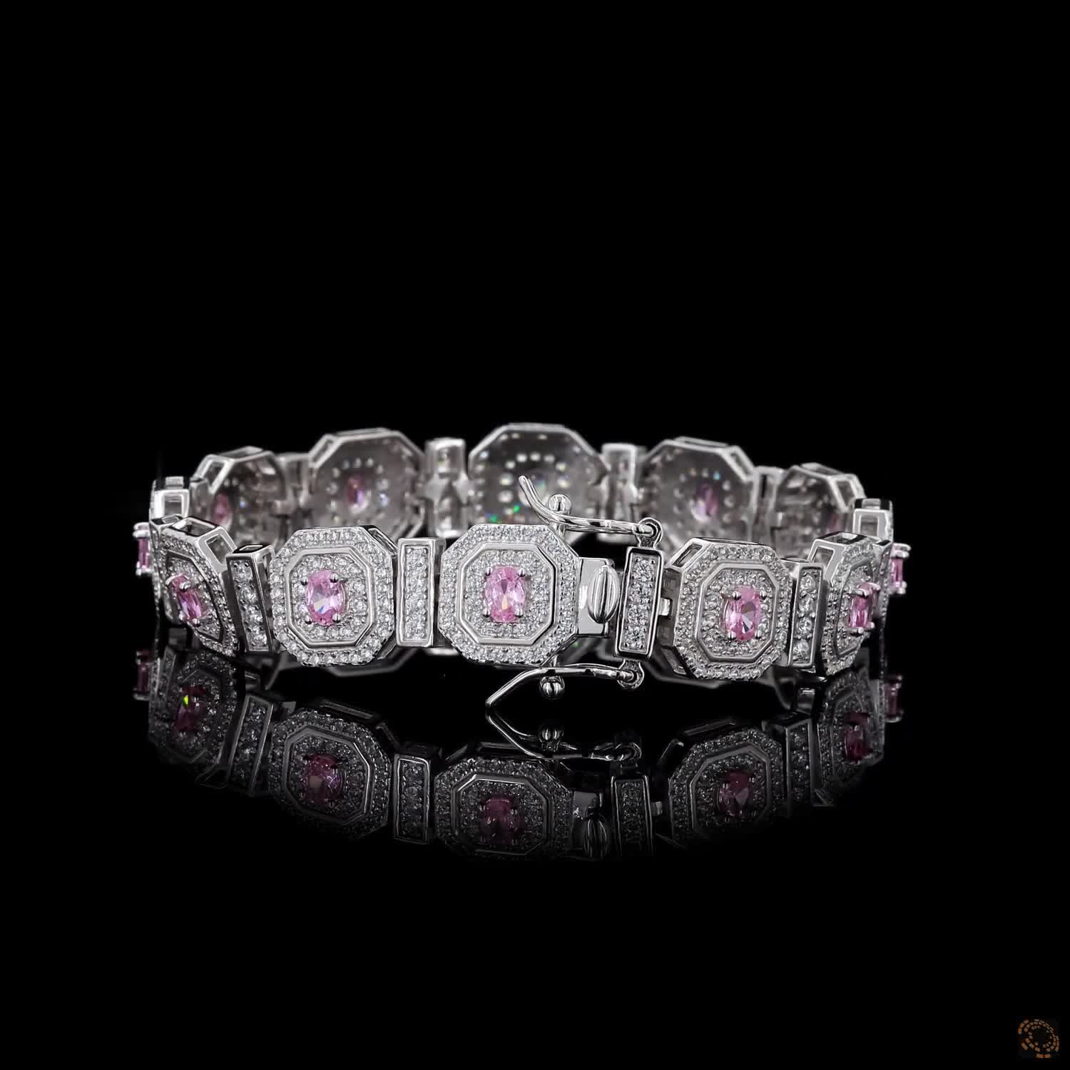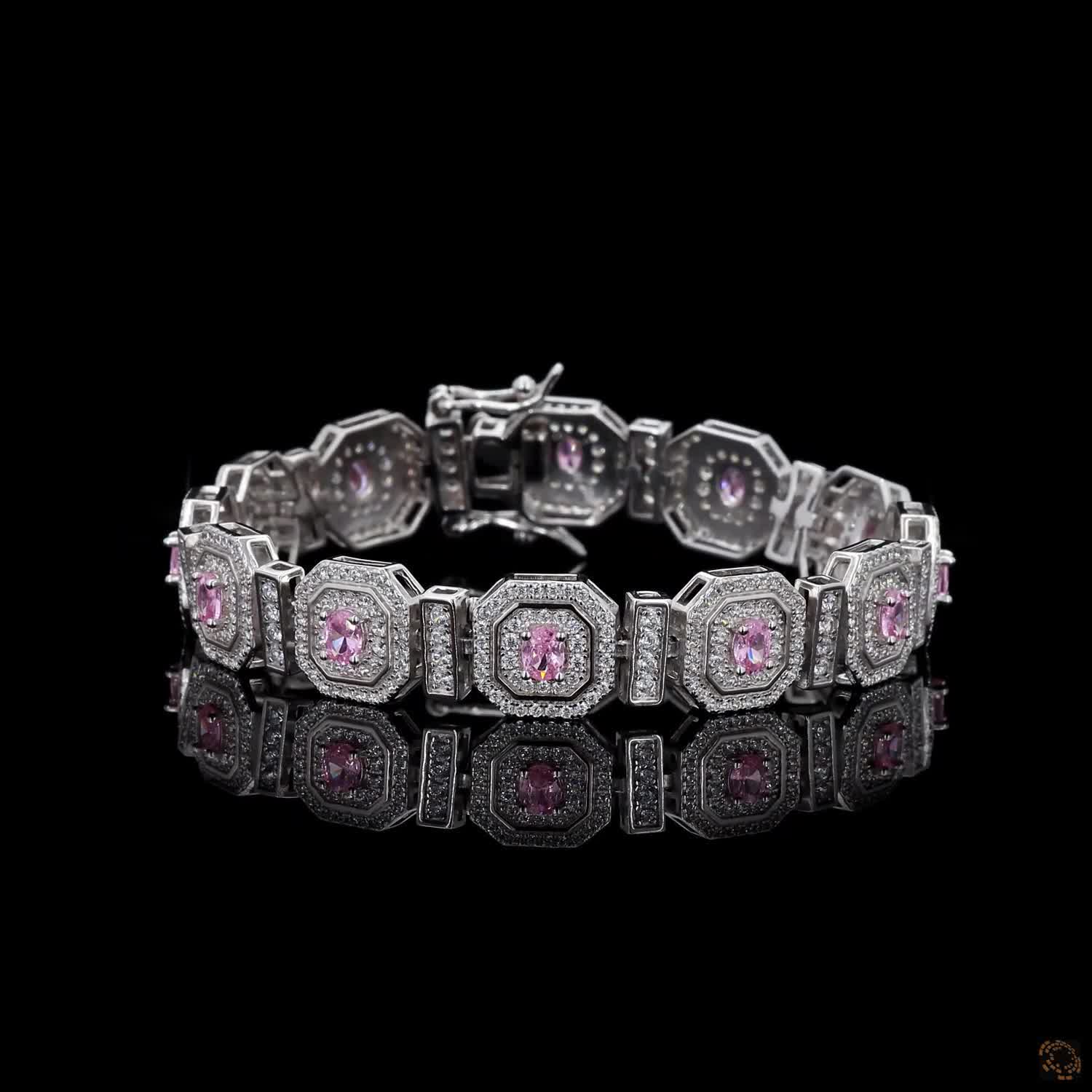 Rosé Quadrille unfolds in a sequence of sculpted square motifs, each one framed in white diamond light and centred with a blush-pink oval that draws the eye inward. The geometry is deliberate, almost architectural — yet the colour brings warmth, romance, and quiet femininity to every movement of the wrist.